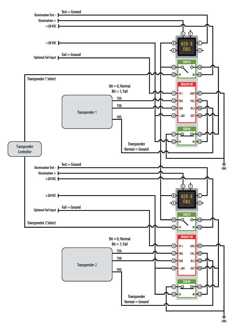In this application, two identically configured annunciators each contain an SR429/1M converter (Active Low Configuration), a normally open SSR (SSR1H) and a normally closed SSR (SSR2H). Each transponder is being monitored independently by sending ARINC 429 data stream (Bit = 0; Normal, Bit = 1; Fail) and a discrete analog output for “transponder failure” (Normal = Ground, Fail = Open) to it’s respective SR429/1M.