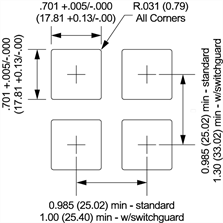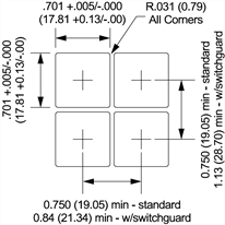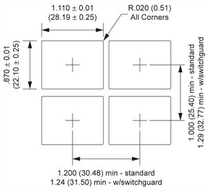Panel cutouts for Standard Square and Large Rectangular bodies are shown below. The spacing between adjacent switches for standard installations (not using an optional switchguard) and installations utilizing a switchguard are also noted.